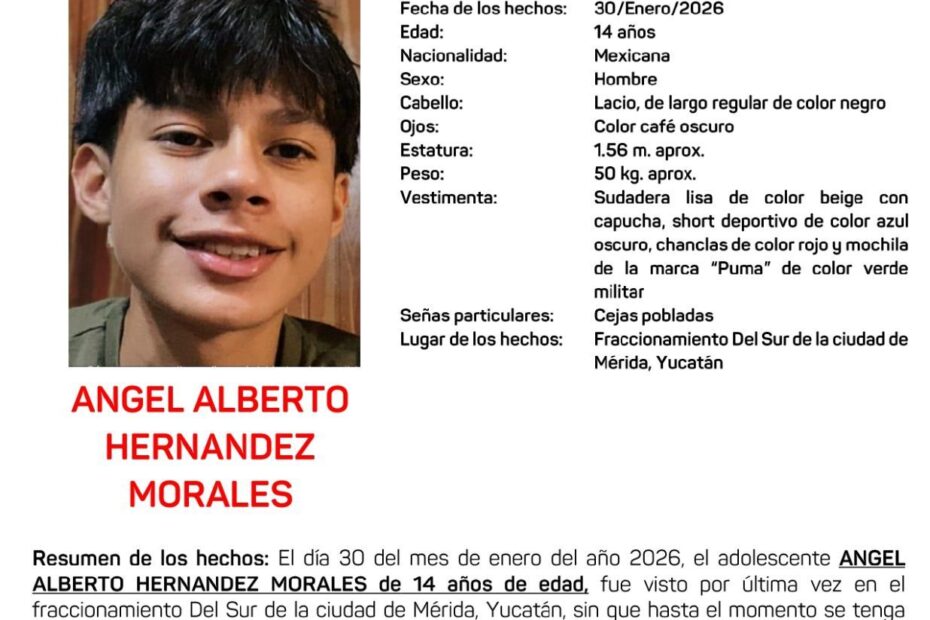 La Fiscalía General del Estado activó una Alerta Amber tras la desaparición de un adolescente identificado como Ángel Alberto Hernández Morales, de 14 años, quien… Read More »Activan Alerta Amber por la desaparición de un adolescente el sur de Mérida