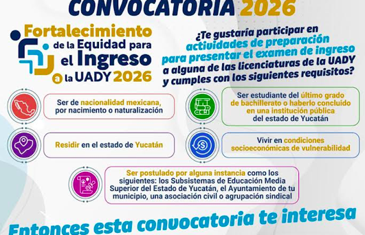 Desde 2022, la convocatoria “Fortalecimiento a la Equidad” de la Universidad Autónoma de Yucatán (UADY) ha permitido que 415 estudiantes de 75 municipios accedan a… Read More »UADY mantiene abierta convocatoria “Fortalecimiento a la Equidad”