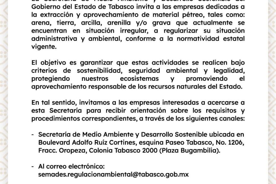 La Secretaría de Medio Ambiente y Desarrollo Sostenible del Gobierno del Estado de Tabasco invita a las empresas dedicadas a la extracción y aprovechamiento de… Read More »SEMADES LLAMA A EMPRESAS A REGULARIZAR SU SITUACIÓN ADMINISTRATIVA Y AMBIENTAL, CONFORME A LA NORMATIVIDAD ESTATAL VIGENTE