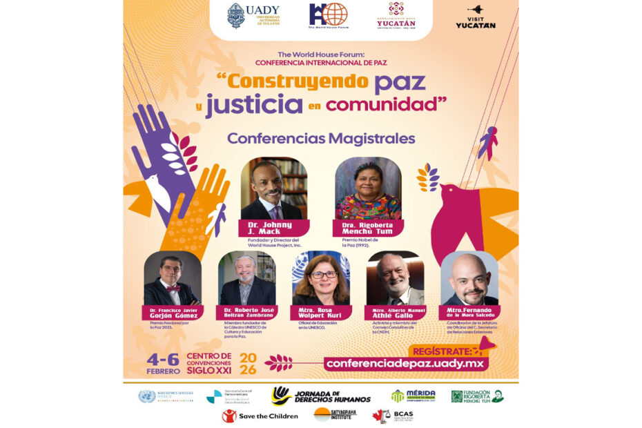 La Universidad Autónoma de Yucatán (UADY) en coordinación con The World House Project, Inc. y el Gobierno del Estado de Yucatán, convoca a la Conferencia… Read More »Voces internacionales se reunirán en Mérida para construir la paz, del 4 al 6 de febrero