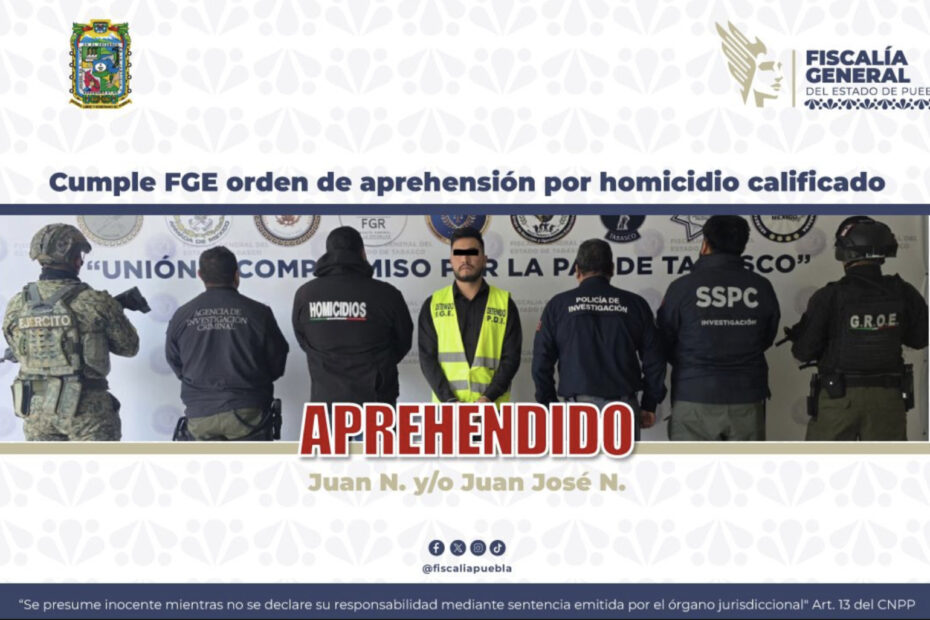 La Fiscalía General del Estado de Puebla (FGE), en colaboración con autoridades del estado de Tabasco, cumplió una orden de aprehensión en contra de Juan… Read More »Cumple FGE orden de aprehensión por homicidio calificado