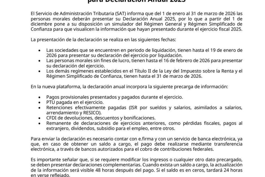 El Servicio de Administración Tributaria (SAT), órgano desconcentrado de la Secretaría de Hacienda y Crédito Público, informa que a partir de este día se encuentra… Read More »SAT habilita simulador para la Declaración Anual 2025 de personas morales