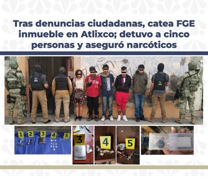 La Fiscalía General del Estado de Puebla detuvo a cinco personas luego de realizar un cateo en un inmueble localizado en el municipio de Atlixco.… Read More »FGE detiene a cinco presuntos narcomenudistas en Atlixco