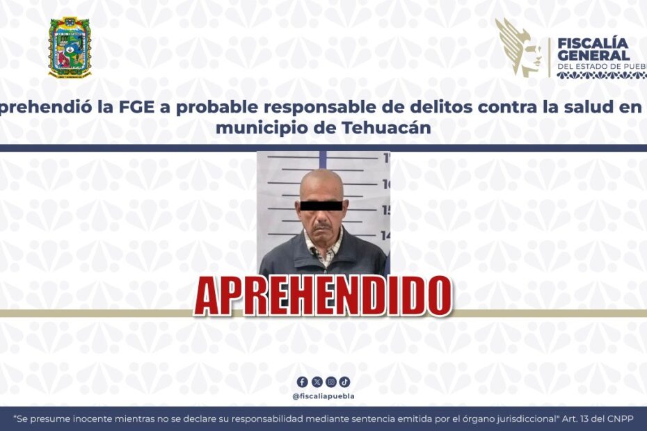 La Fiscalía General del Estado dio cumplimiento a la orden de aprehensión en contra de Edmundo N., de 56 años de edad, por su probable… Read More »Aprehendió la FGE a probable responsable de delitos contra la salud en el municipio de Tehuacán