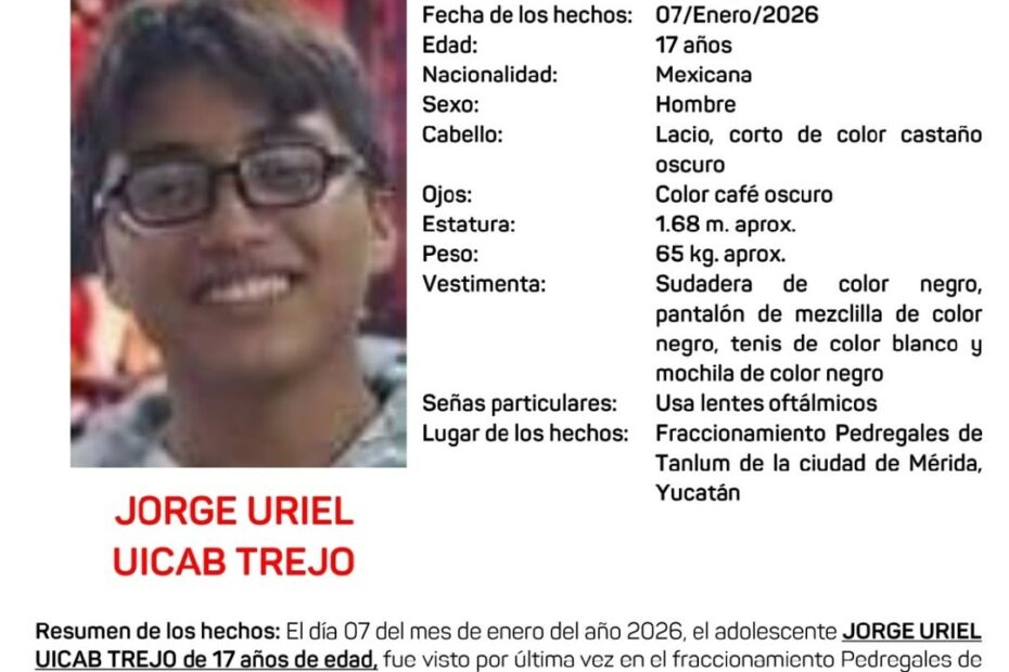 La Fiscalía General del Estado activó una Alerta Amber en Yucatán para localizar a un adolescente de 17 años, luego de que se reportara su… Read More »Activan Alerta Amber por la desaparición de un adolescente en Mérida