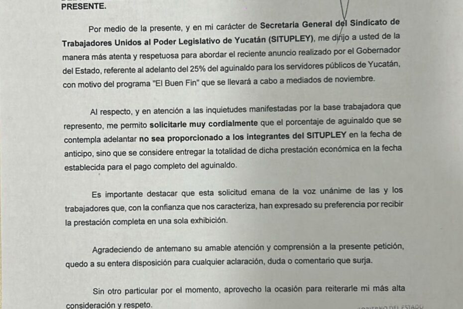 Las agrupaciones que representan a la base trabajadora del Congreso del Estado informaron de manera formal su petición de que el aguinaldo se pague completo… Read More »Sindicados del Congreso del Estado solicitaron entrega de aguinaldo en diciembre con único pago