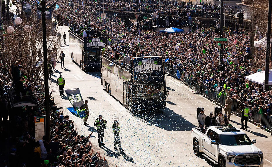 El equipo, staff y personal administrativo salieron del inmueble para comenzar el desfile por las calles de Seattle, donde se volcó la famosa afición, conocida como el “Jugador 12”.