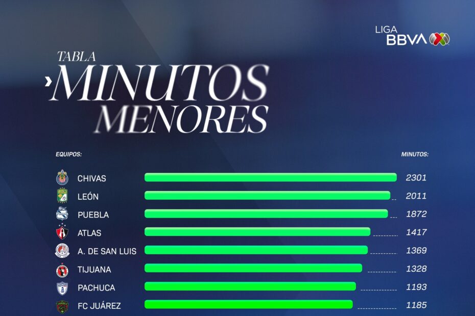 La Liga MX dio a conocer el registro de minutos otorgados a jugadores menores en el Apertura 2025, donde Chivas se ubica como líder destacado con un total de 2,301 minutos, superando ampliamente el requisito mínimo de 1,170 minutos establecido por el reglamento.