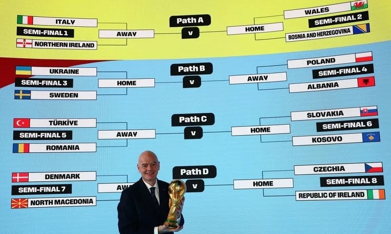 El sorteo celebrado este jueves en la sede de la FIFA en Zúrich (Suiza) fijó también las otras eliminatorias de los 12 equipos europeos participantes: Ucrania-Suecia, Eslovaquia-Kosovo, República Checa-Irlanda, Dinamarca-Macedonia del Norte y Gales-Bosnia.