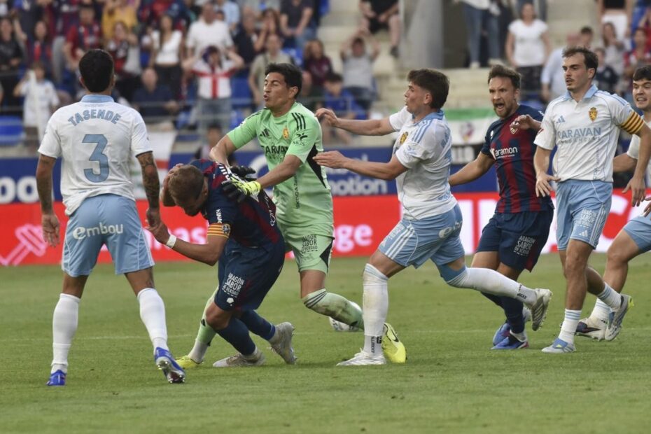 Con 1-0 en el marcador y en el minuto 99, Andrada fue expulsado por empujar a Pulido. Nada más ver la tarjeta roja, el argentino perdió el control y buscó al capitán de Huesca para propinarle un puñetazo en la cara, momento en el que hubo una multitudinaria tángana entre los jugadores en un final caótico que se saldó con varias tarjetas y más expulsiones.