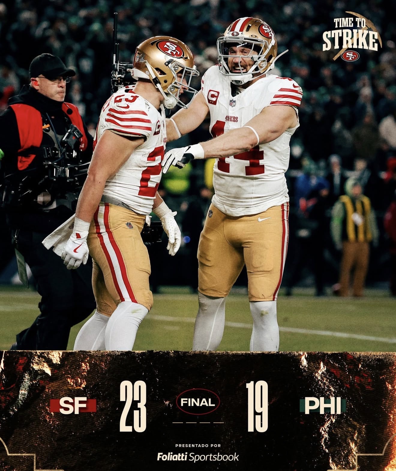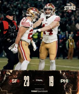 “Los San Francisco 49ers demostraron de qué están hechos al eliminar a los vigentes campeones, los Philadelphia Eagles, con un vibrante marcador de 23-19. Los 49ers superó las lesiones de figuras clave como George para llevarse un triunfo heroico. La ofensiva encontró en Demarcus Robinson a su gran motor con 111 yardas, mientras que una jugada maestra con Christian McCaffrey terminó por sepultar las esperanzas de los locales en el último cuarto.”