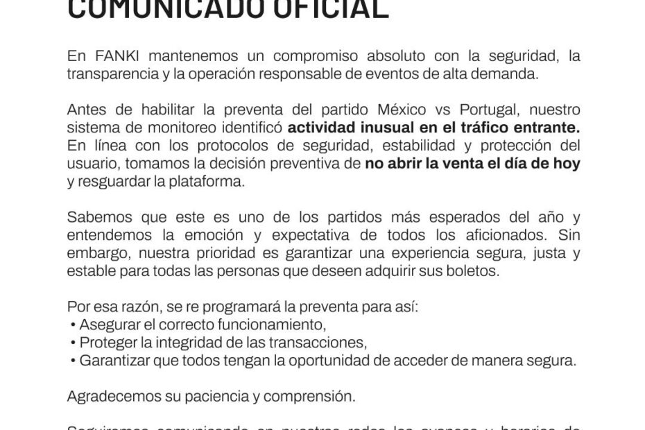 A través de un comunicado difundido en sus redes sociales, Fanki aclaró que los boletos nunca llegaron a liberarse, ya que su sistema detectó un flujo inusual de tráfico antes de iniciar la preventa. Ante esto, la compañía aplicó protocolos de seguridad y optó por frenar el lanzamiento para evitar afectaciones mayores. La empresa aseguró que, debido a la alta expectativa que genera el partido del 28 de marzo de 2026, su prioridad es garantizar un proceso ordenado y equitativo para todos los interesados.
