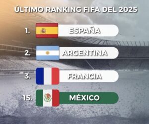 México firme en el 15 del Ranking FIFA México cerró 2025 en el lugar 15 con 1,675.75 puntos, sin cambios desde el 20 de noviembre. España continúa como líder del ranking, seguida por Argentina y Francia. El Tri inició el año en el 19, subió al 17 en abril y alcanzó su mejor posición en julio (13). Tras algunos ajustes menores, terminó cuatro puestos arriba de como lo comenzó. Estados Unidos cerró como la selección más alta de Concacaf en el 14. En el listado del 11 al 20 destacan países como Marruecos, Italia, Colombia, Estados Unidos, México, Uruguay, Suiza, Japón, Senegal e Irán. Los primeros 33 lugares se mantuvieron sin movimientos en la última actualización.