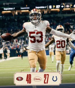 Los 49ers aplastan a Colts y apuntan al liderato de la NFC Los San Francisco 49ers vencieron con autoridad a los Indianapolis Colts en el lunes por la noche, guiados por Brock y Christian McCaffrey, los 49ers alcanzaron marca de 11-4, manteniéndose en la pelea por el primer lugar de la conferencia nacional. La ofensiva fue dominante y el equipo no permitió despejes durante largos tramos del partido, mostrando control total del juego y confirmando su buen momento rumbo a los playoffs. Con este triunfo, San Francisco se mantiene firme en la lucha por la localía en postemporada, un factor clave considerando que el Super Bowl LX se jugará en su propio estadio.