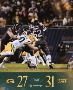 Los Packers dominaron ampliamente la primera mitad, yéndose al descanso con una cómoda ventaja de 21-3 gracias a tres pases de anotación. Sin embargo, el panorama cambió en el último cuarto; tras una serie de ajustes defensivos, los Bears reaccionaron con un touchdown terrestre y una conexión aérea que le dio la vuelta al marcador con menos de dos minutos por jugarse. La derrota de Green Bay se vio sentenciada por las fallas en los equipos especiales, errando un gol de campo crucial de 45 yardas y un punto extra que obligó a Love a buscar un touchdown desesperado en la última serie.