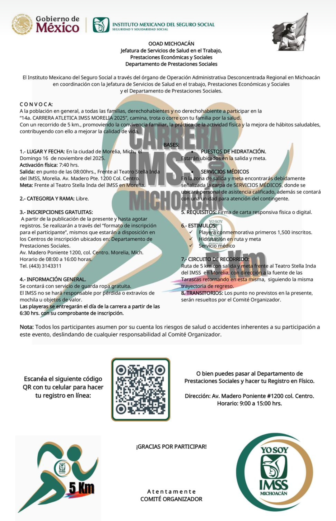 Este evento está enfocado a familias, adultos, jóvenes e infantes, quienes podrán caminar, trotar o correr 5 kilómetros, con salida en el Teatro “Stella Inda” del Instituto, para proseguir por la principal ruta de Morelia, cruzar por la Catedral, llegar al Monumento a “Las Tarascas” y regresar al punto de inicio en las oficinas de la representación del Seguro Social en el estado.