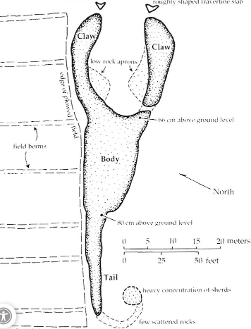 La representación del arácnido, ubicada cerca del llano de la Taza, tiene una longitud de 62.5 metros, su cuerpo, cabeza y pedipalpos (pinzas) se extienden en dirección este y noroeste; 13.2 metros de ancho por 80 centímetros de alto, y el espacio entre los pedipalpos es de 22.1 metros. La cola y el aguijón contienen fragmentos de cerámica.