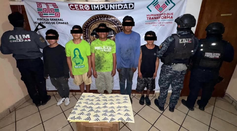 Con el fin de hacer cumplir la Ley y garantizar el estado de derecho de la ciudadanía chiapaneca al realizar patrullajes de prevención, disuasión del delito, proximidad social y como parte de operativos, sobre la Calle Central Norte esquina Octava Norte, Colonia Santa Cecilia, detuvieron a Paulo “N”, Jesús “N”, Cristian “N” Juan “N” y Adrián “N” a quienes previa inspección a su persona y pertenencias les fue asegurado 57 dosis de un polvo cristalino con las características propias del cristal y una motocicleta Marca Italika Forza, modelo 2018, color negro.