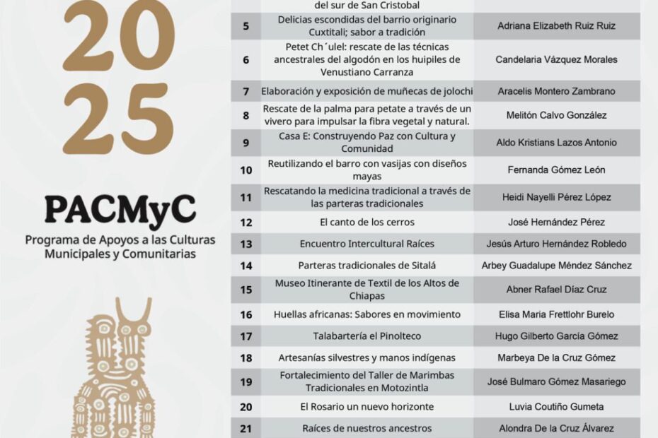 Para conocer la lista de los seleccionados consulta la página www.conecultachiapas.gob.mx/uploads/resultados/resutados_PACMyC_2025.jpg
