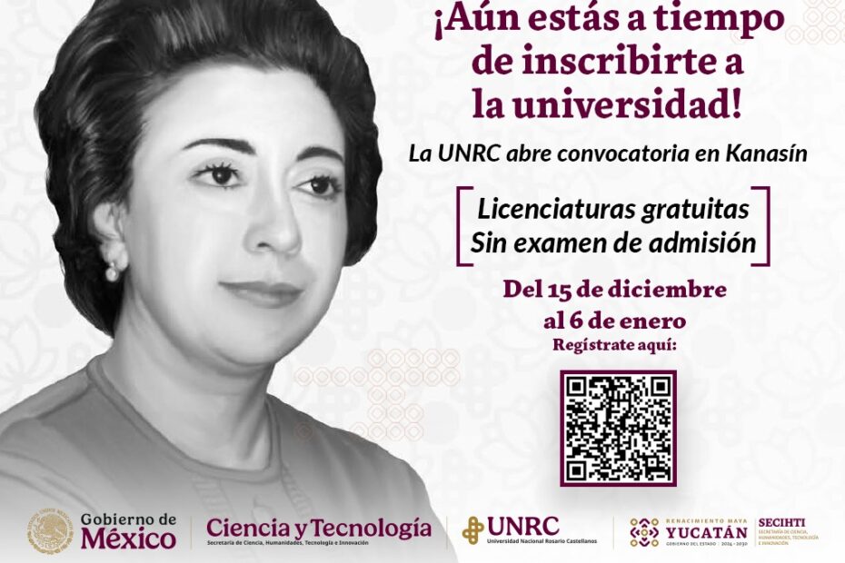 Con la finalidad de ampliar el acceso a la educación superior en 2026, el Gobierno del Estado informó que la Universidad Nacional Rosario Castellanos, Unidad Kanasín, mantiene abierta su convocatoria de ingreso, con una oferta educativa gratuita, de calidad, con enfoque humanista y sin examen de admisión, dirigida a personas que concluyeron el bachillerato o se encuentran próximas a egresar.