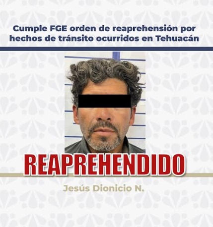 La Fiscalía General del Estado de Puebla (FGE) cumplió una orden de reaprehensión en contra de Jesús Dionisio N., por su presunta responsabilidad en hechos ocurridos en el municipio de Tehuacán, donde provocó un accidente vial que dejó a una persona lesionada.
