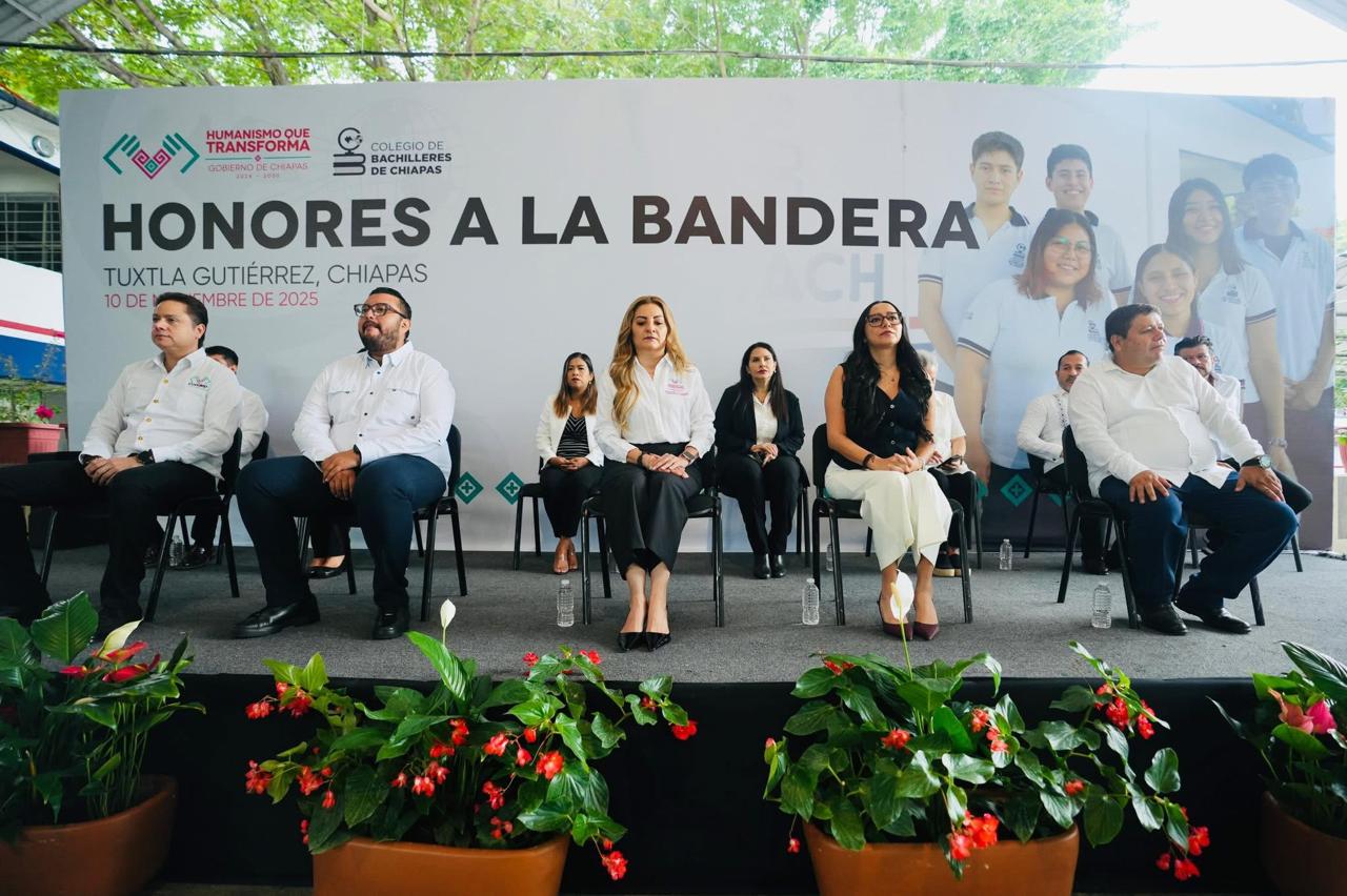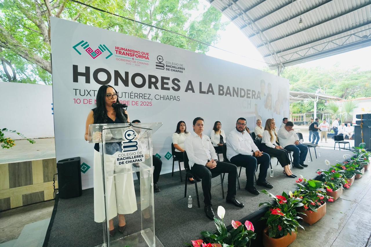 “En el Cobach trabajamos con transparencia, enfocados en consolidar un modelo educativo incluyente, humanista y cercano a la gente, pero también fortaleciendo cada acción con responsabilidad y sentido ético”, mencionó la titular de este subsistema en su mensaje dirigido a asistentes que se dieron cita en el plantel 13 Tuxtla Oriente, donde se llevó a cabo el homenaje al lábaro patrio.