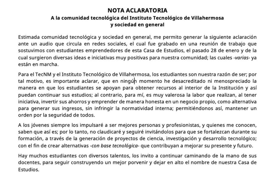 El Instituto Tecnológico de Villahermosa emitió una nota aclaratoria dirigida a su comunidad estudiantil y a la sociedad en general, tras la difusión en redes sociales de un audio grabado durante una reunión de trabajo con estudiantes emprendedores.
