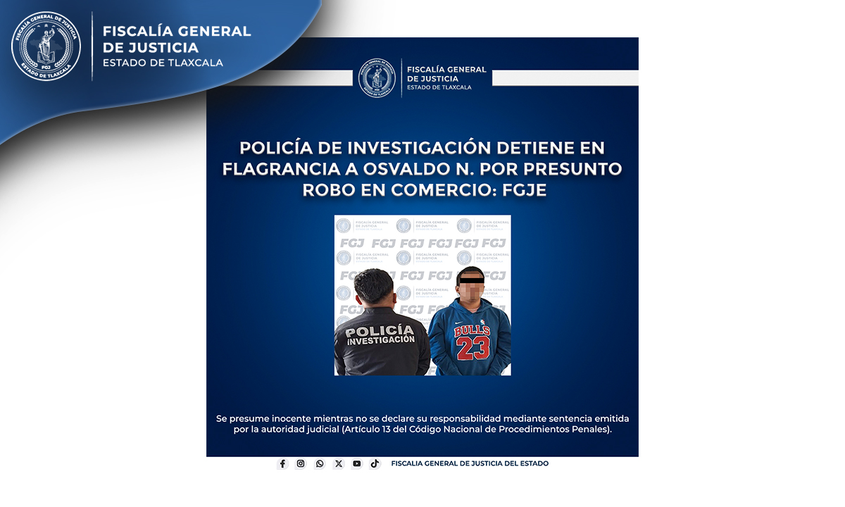 La Fiscalía General de Justicia del Estado reitera su compromiso de presentar ante un Juez a toda persona que atente contra la seguridad y el patrimonio de la ciudadanía tlaxcalteca.