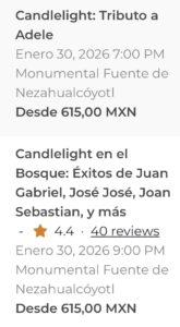 Entre dichos conciertos están :- un tributo a Adele y otro dedicado a Juan Gabriel, José José, Joan Sebastian y más, en un formato íntimo a la luz de miles de velas.