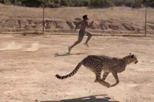 El desafío consistió en correr contra el animal terrestre más veloz del mundo, un encuentro que generó gran expectativa por lo inusual y arriesgado del reto. Aunque el inicio de la carrera fue parejo, el guepardo terminó imponiéndose claramente en velocidad.