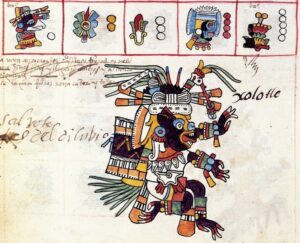 El Dios Xólotl es parte de la mitología azteca y aparece en la leyenda del Quinto Sol (nuestra era). Es el hermano gemelo de Quetzalcóatl y fue el Dios que se rehusó a sacrificarse para darle movimiento al Sol.