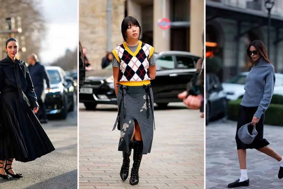 Las faldas midi son una prenda clave para el Otoño-Invierno 2025 y se pueden combinar con una variedad de calzado de moda, desde botas altas hasta zapatos planos y bailarinas, para crear looks elegantes y sofisticados.