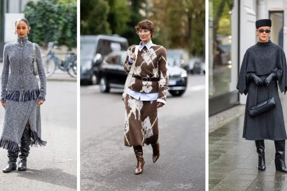 Comenzamos con las faldas midi de punto combinadas con suéteres largos de estampado coordinado. Los colores marrón y blanco predominan en la propuesta, con sutiles acentos en amarillo limón que aportan dinamismo y jovialidad al look. Las expertas optan por incluir una camisa de vestir y un cinturón delgado a la altura de la cintura, como si se tratara del look de oficina más cálido imaginable, combinándolo con botas puntiagudas de tacón para lucir elegante y arreglada.