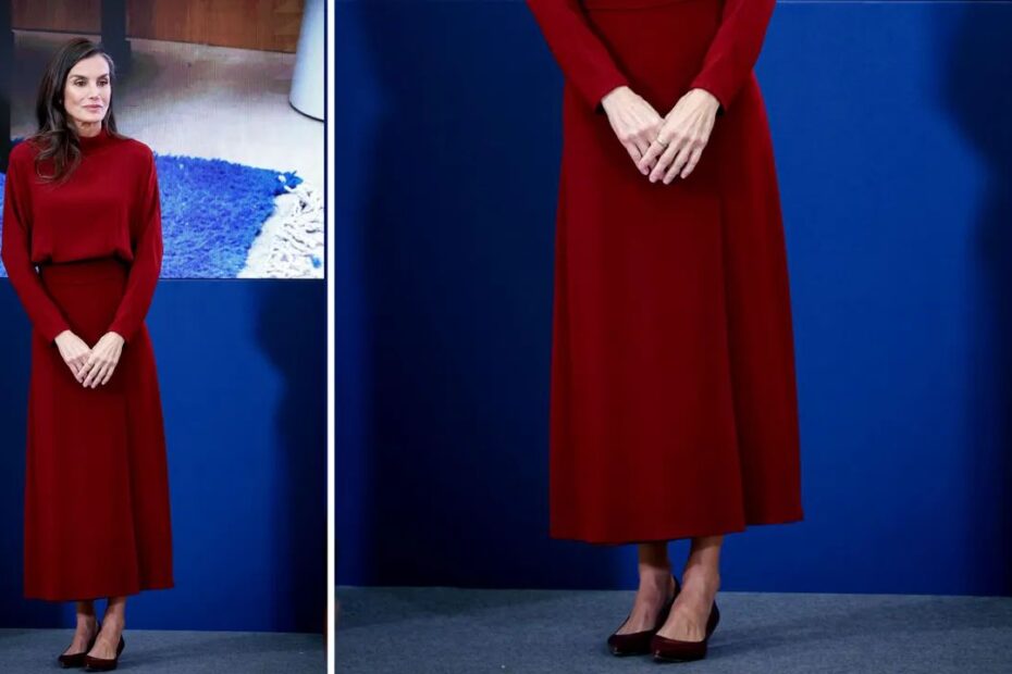 La reina de España optó por una sencilla falda larga confeccionada en un tipo de tejido de lana firme en el moderno color rojo, con cinturilla ancha y un sencillo efecto envolvente. La reina Letizia la combinó con un suéter a juego de sutil corte oversize, manga larga y cuello ligeramente alto. Completó el look con unos zapatos de tacón bajo, también en rojo, pero en un tono aún más oscuro.