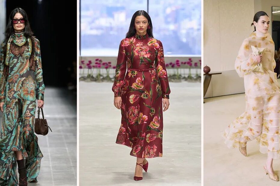 Colores de otoño: Los estampados florales se presentan en tonos oscuros como berenjena, burdeos, azul petróleo y negro.