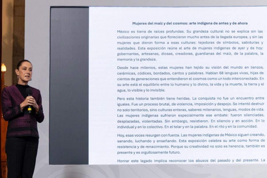 A la entrada de la exposición se exhibe un texto de la presidenta Claudia Sheinbaum que, entre otras cosas, destaca que el encuentro de nuestras culturas fue un proceso violento, de invasión y que la conquista no fue un encuentro entre iguales, sino que se intentó destruir, no solo territorios, también saberes milenarios, lenguas y modos de vida.