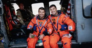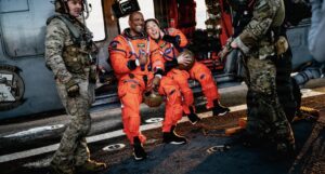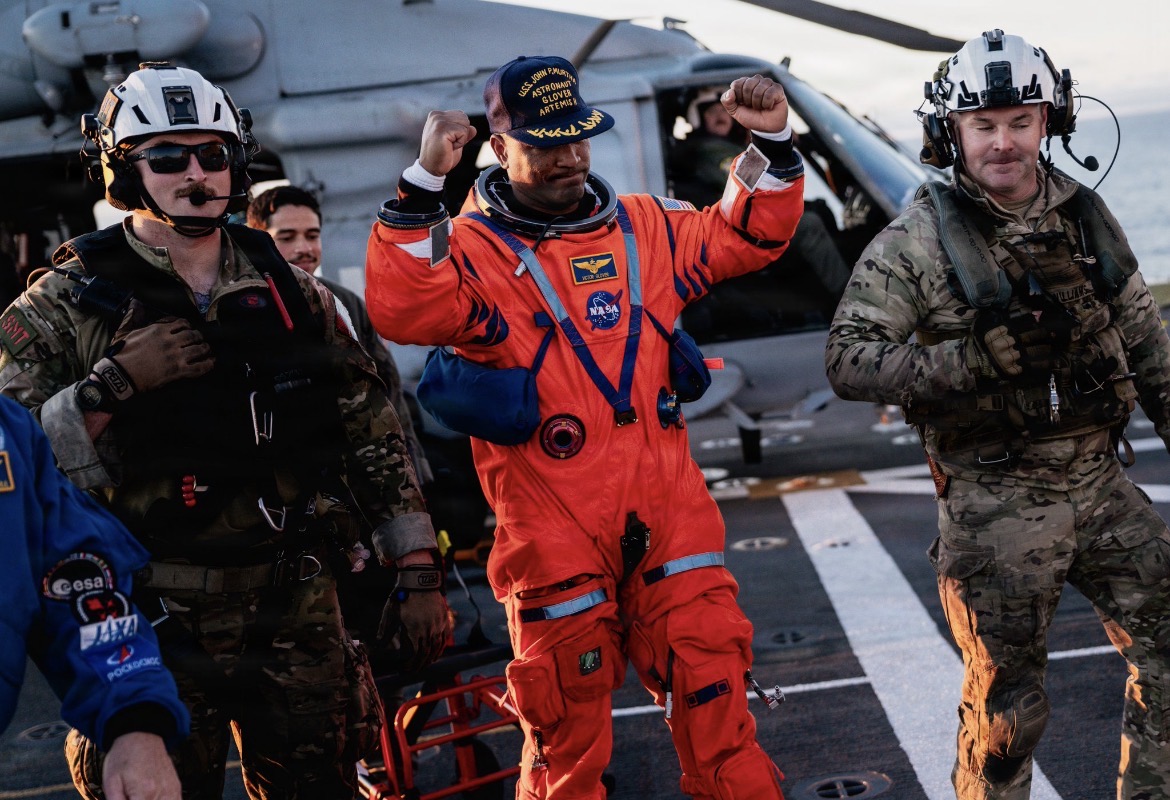 Desde el lado lejano de la luna hasta la cubierta de vuelo, los astronautas de Artemis II, Reid Wiseman, Victor Glover, Christina Koch y Jeremy Hansen, llegan a la cubierta de vuelo del USS John P. Murtha (LPD 26) tras su regreso a la Tierra y amerizaje en el Océano Pacífico.