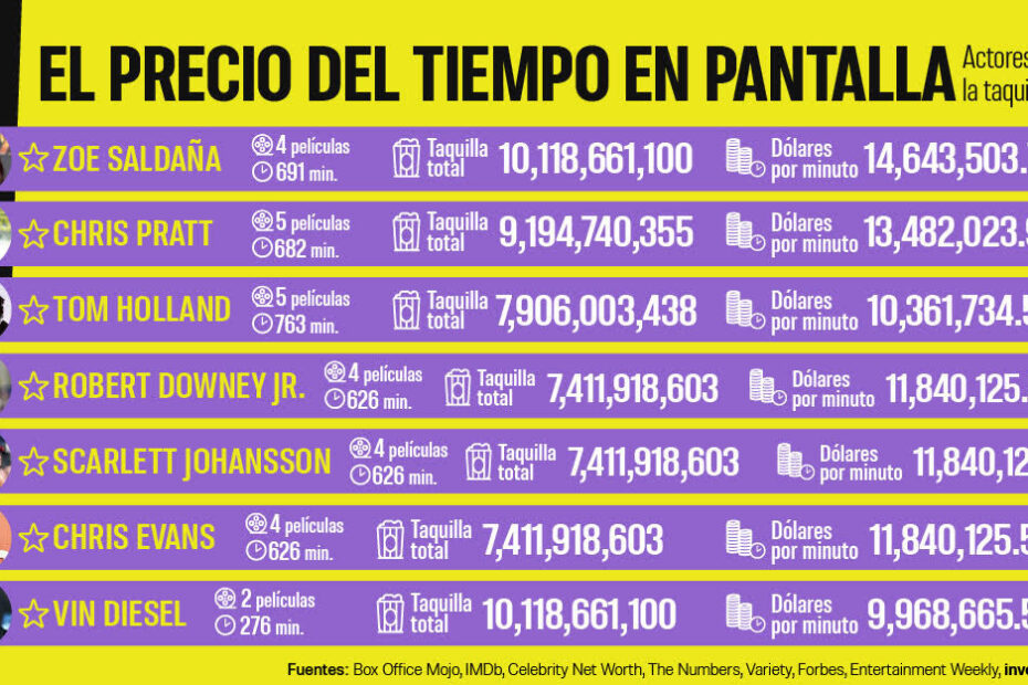 En la última década, la conversación sobre el valor de un actor ya no se limita a su salario: existe una nueva métrica complementaria que aporta otra lectura relevante para la industria y el negocio del cine. Si se divide la recaudación mundial de las películas en las que un intérprete ha participado por la duración total de esas mismas películas, se obtiene una cifra que muestra cuántos dólares “representa” cada minuto de metraje asociado a ese actor. No es una atribución causal (la taquilla no nace exclusivamente de una persona), pero sí es una forma contundente de medir la exposición económica.