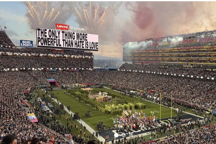 Así arrancó la máxima fiesta del futbol americano, donde el cantante  prometió y cumplió con una gran fiesta, acompañado de grandes figuras que iban desde Cardi B, la colombiana Karol G, el chileno Pedro Pascal, Jessica Alba, Young Miko, y David Grutman hasta llegar a la Lady Gaga y Ricky Martin, quienes fueron sus únicos acompañantes vocales en los minutos de espectáculo.