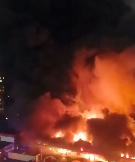 Un voraz incendio se desató en un mercado de San Petersburgo, Rusia, consumiendo al menos 1,500 metros cuadrados del inmueble.
