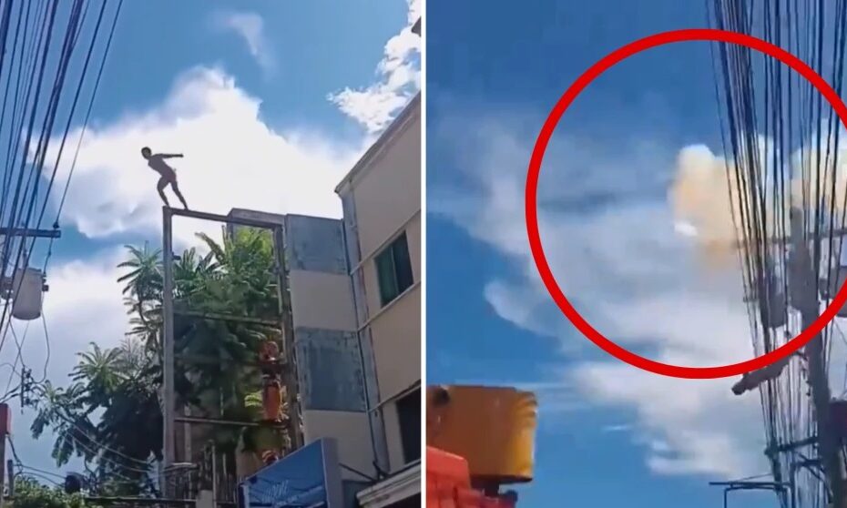 Un video de apenas 38 segundos difundido en redes sociales muestra un momento estremecedor: un hombre vestido con short se lanza desde una estructura metálica hacia un poste con cables de alta tensión, provocando una descarga eléctrica que lo hace caer violentamente al suelo.
