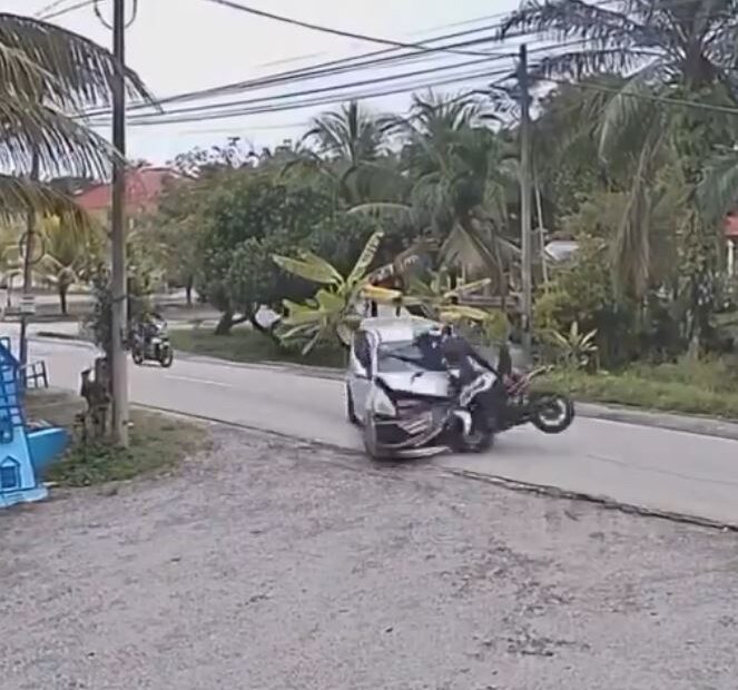 En ese momento, una moto a gran velocidad se aparece a gran velocidad y se impacta contra la parte delantera de la camioneta, lo cual causó que el joven que manejaba la moto “saliera volando”, aterrizando dentro de un arroyo cercano.