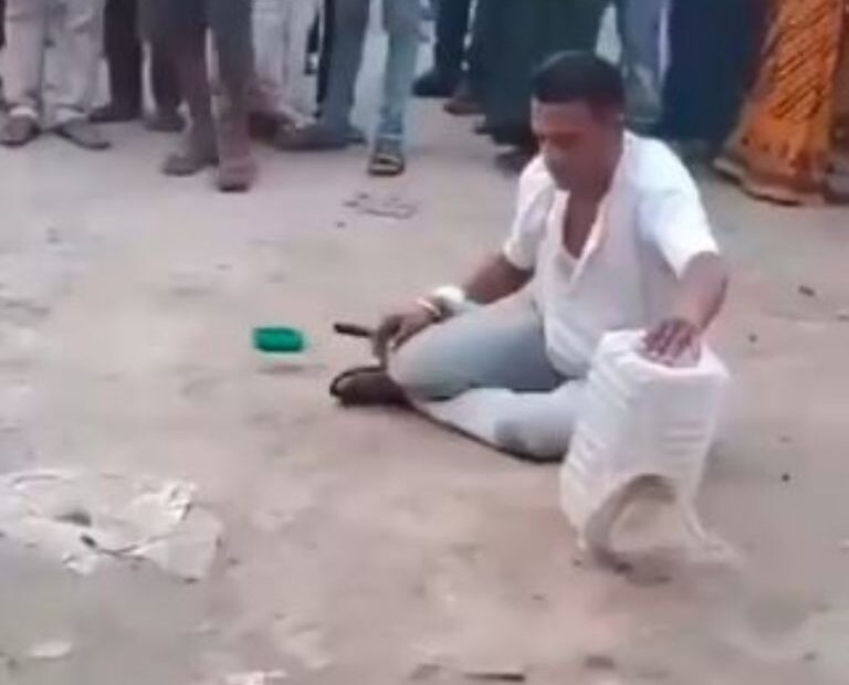 En plataformas digitales circula un video en el que se aprecia el momento exacto en el que un domador de cobras es mordido por uno de estos peligrosos ejemplares en las calles de la India.