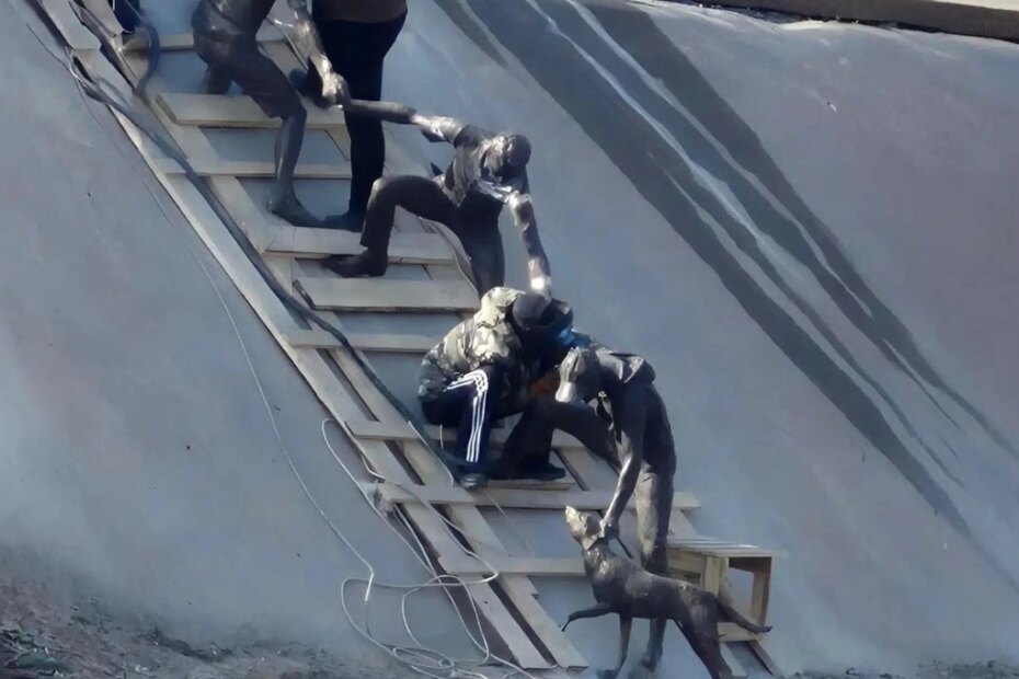 La obra recuerda un hecho ocurrido en 2016, cuando un perro callejero cayó al empinado canal de hormigón del embalse de Sayran. Un joven no dudó en lanzarse al agua para rescatarlo, pero terminó también en peligro. Fue entonces cuando varias personas que presenciaban la escena se unieron, formando una cadena humana que permitió salvar a ambos.
