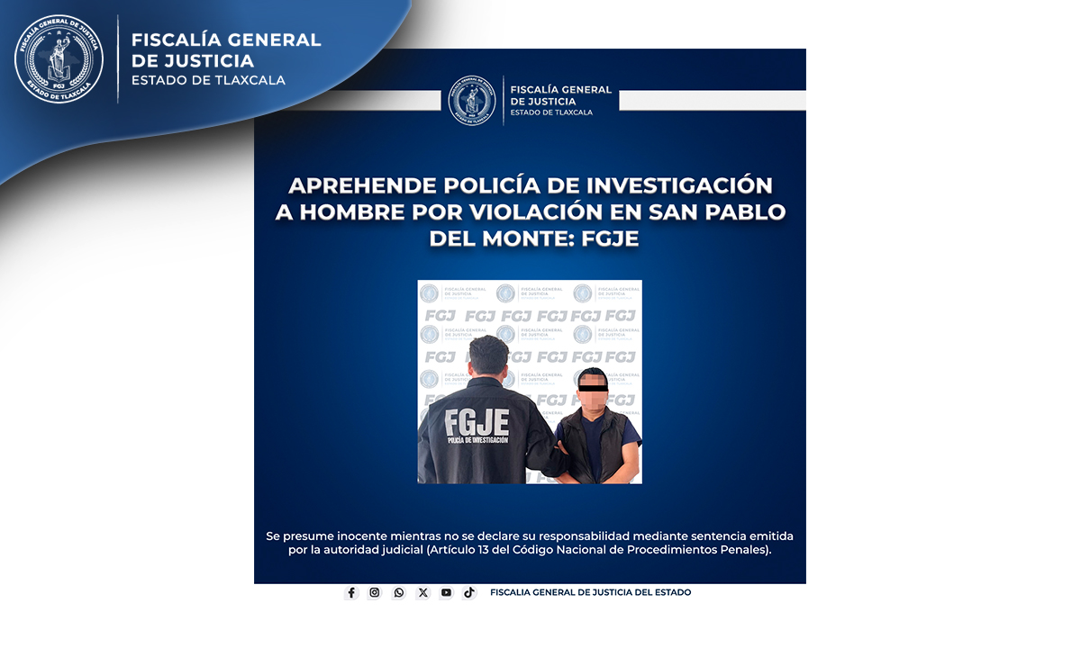 Agentes de la Policía de Investigación de la Fiscalía General de Justicia del Estado (FGJE) aprehendieron a Gilberto N. por el delito de violación, cometido en San Pablo del Monte.