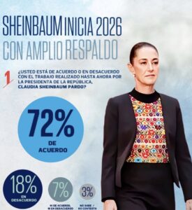 La presidenta de México, Claudia Sheinbaum, arranca el 2026 con una aprobación ciudadana de 72% de acuerdo con la encuesta de QM Estudios de Opinión, en alianza con Heraldo Media Group.