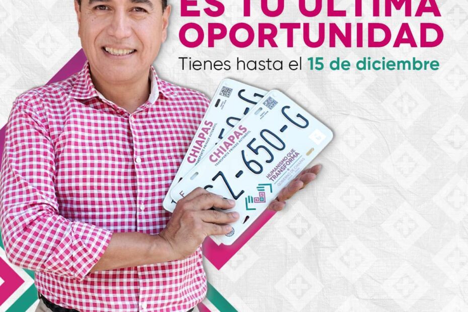 La Secretaría de Hacienda de Chiapas recordó que el próximo 15 de diciembre de 2025 será la fecha límite para que los propietarios de vehículos, ya sean particulares o del servicio público, aprovechen para realizar el trámite de canje de placas.