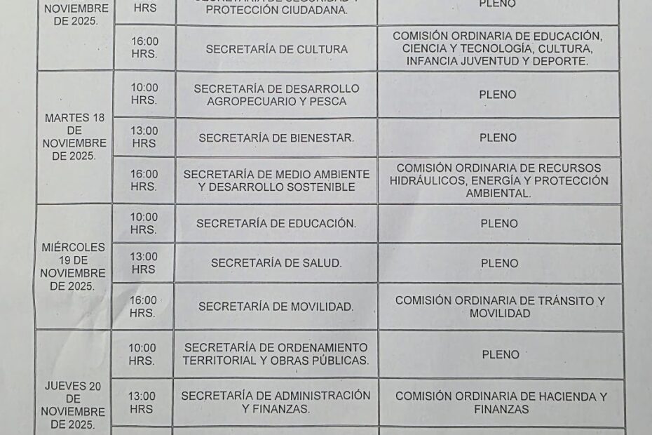 Las comparecencias iniciarán el próximo lunes a las 10:00 horas con la participación del secretario de Gobierno, y continuarán por la tarde con la intervención del secretario de Seguridad.