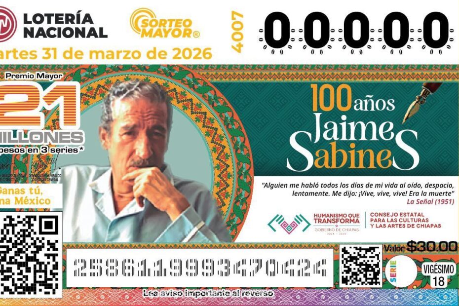 Este 31 de marzo será el sorteo oficial con el cachito de lotería en honor a Jaime Sabines, reafirmando que su legado literario sigue siendo un puente vivo entre generaciones y territorios.