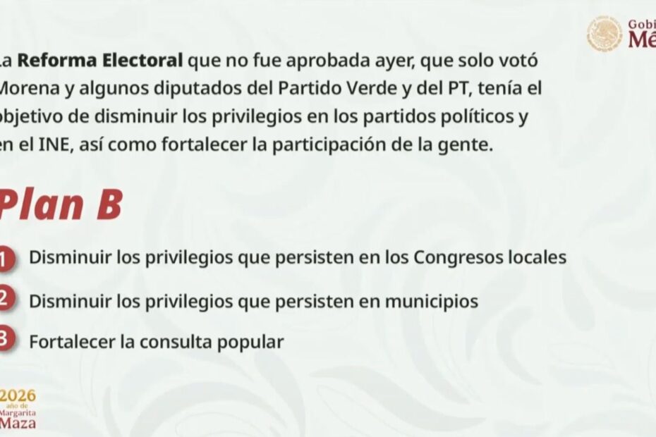 La Presidenta de México, Claudia Sheinbaum Pardo, informó que el próximo lunes 16 de marzo enviará el Plan B de la iniciativa de Reforma electoral que consiste en disminuir los privilegios en Congresos locales y en municipios, destinar un tope máximo de los recursos que se les destinan, así como fortalecer la consulta popular.